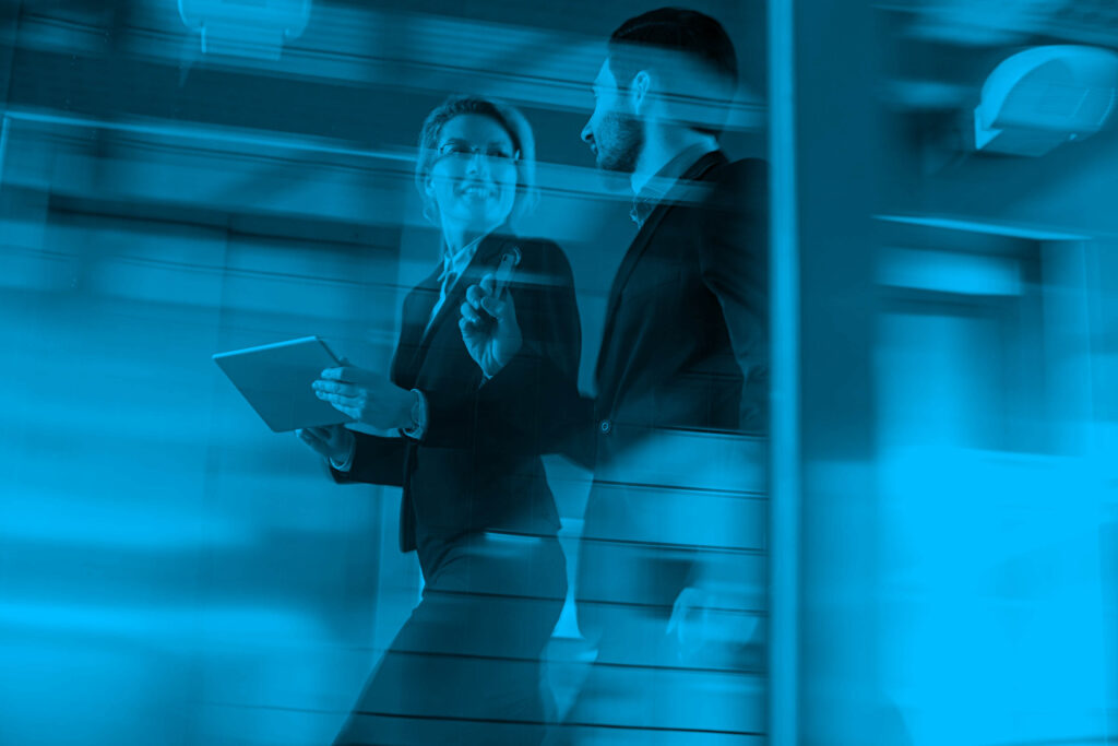 Business professionals having a conversation while passing through office building lobby.