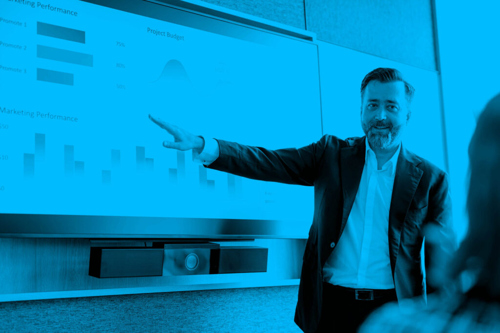 CEO giving peptalk to businesspeople at meeting in big conferenceroom